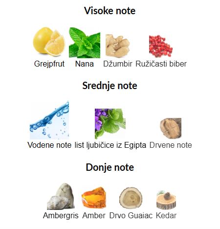 - Gornje note: Ružino drvo (Palisander), Lavanda, Cimet, Jabuka