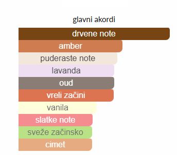 - Bazne note: Agar (Oud), Sandalovo drvo, Amber, Vanilija, Mošus