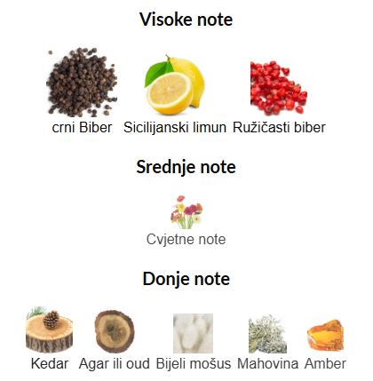 - Gornje note: Crni biber, Sicilijanski limun, Ružičasti biber