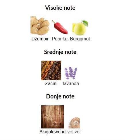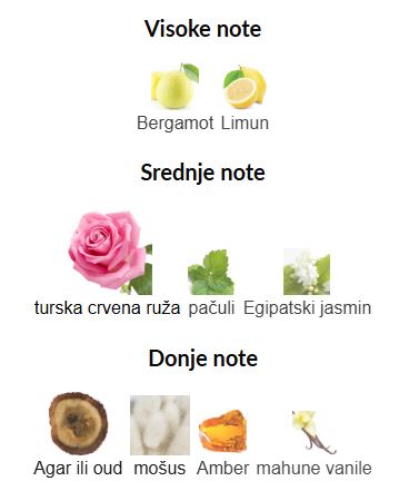 - Srednje note: Turska crvena ruža, Pačuli, Egipatski jasmin