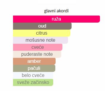 - Bazne note: Agar (Oud), Mošus, Amber, Mahune vanile